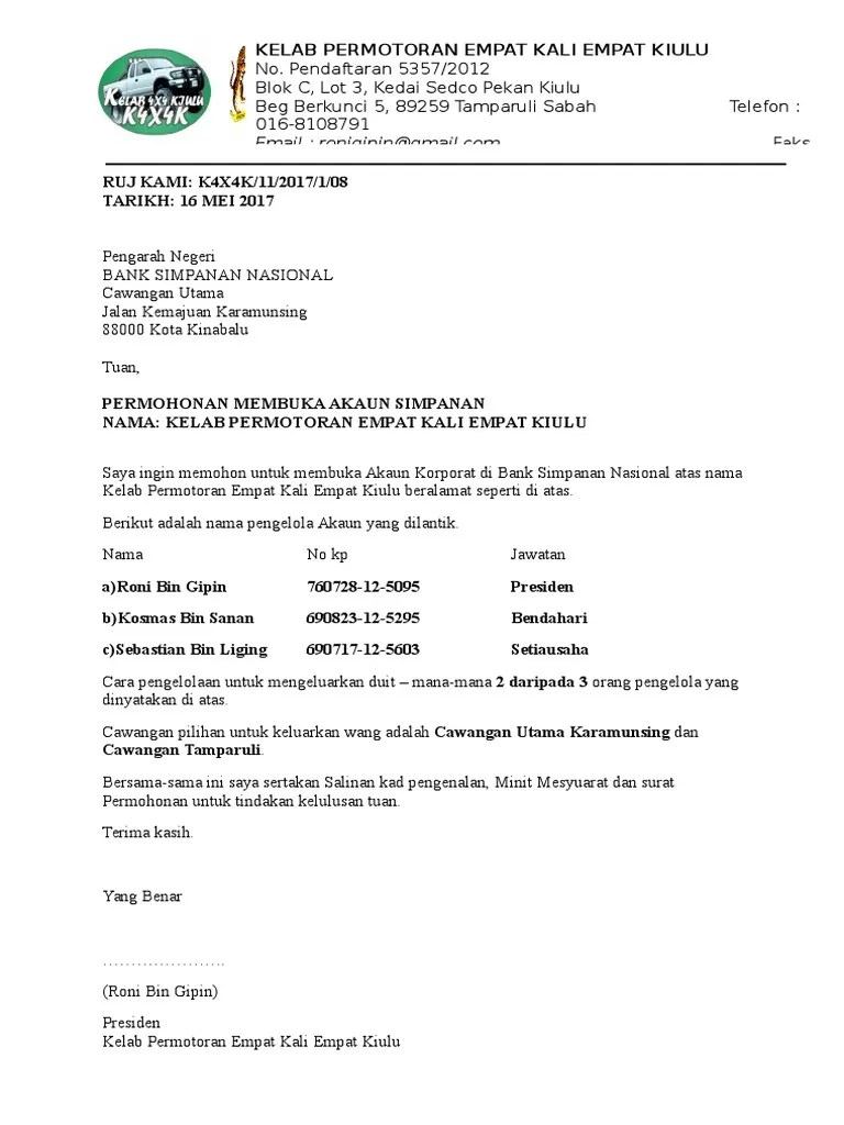 Application Name: Contoh Surat Permohonan Membuka Akaun Kelab